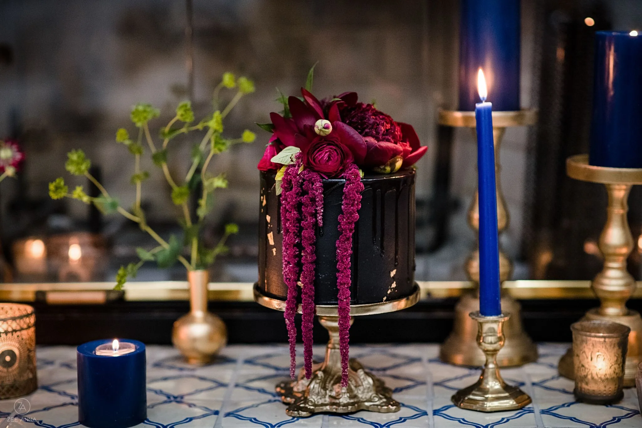 A decorative black cake with pink and red flowers, garnished with pink hanging beads, on a silver-colored cake stand. The cake is on a table with candles and blue and gold candlesticks, and a background of plants and a brick wall.